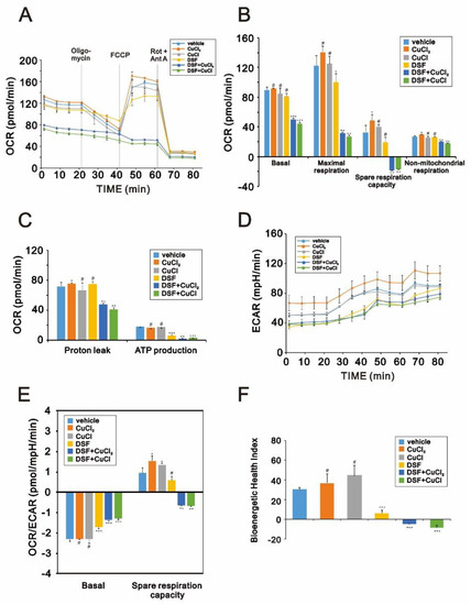 Effects of DSF, copper ions, and DSF-copper complexes on the oxygen consumption rate (OCR) and extracellular acidification rate (ECAR) in OECM-1 cells. (A–D) OECM-1 cells were treated for 2 h or 4 h with 0.5 μM DSF complexed with 5 μM Cu+ or Cu2+, after which cellular OCR (A–C), ECAR (D), OCR/ECAR (E), and the bioenergetic health index (F) were measured in XF24 bioenergetic assays. # p > 0.05, * p < 0.05, ** p < 0.01, and *** p < 0.001.