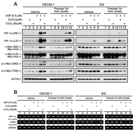 Effect of ROS on HIF-1α and c-Myc expression in OECM-1 and SG cells. OECM-1 and SG cells were treated for 2 h or 4 h with the indicated concentrations of Cu+ or Cu2+ complexed in the absence or presence of 0.5 μM DSF with or without pretreatment for 1 h with 5 mM NAC. (A) Western blot analysis for HIF-1α and c-Myc (total, nick, phosphorylated at T58 or S62) protein expression. (B) RT-PCR analysis for HIF-1α and c-Myc mRNA expression. ACTN was the protein loading control; GAPDH mRNA was the mRNA loading control. The results are representative of three independent experiments. Protein and PCR bands were quantified through pixel density scanning and evaluated using ImageJ, version 1.44, 31 January 2011 (http://imagej.nih.gov/ij/ (accessed on 15 March 2021)). The fold change (shown above the bands) was calculated by normalization to the internal control protein (ACTN) or gene (GAPDH).