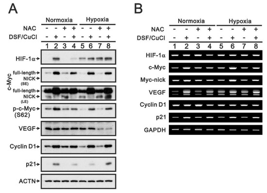 Functional roles of HIF-1α induced by DSF-CuCl under normoxia or hypoxia in OECM-1 cells. OECM-1 cells were treated for 4 h with 0.5 μM DSF/2 μM CuCl under normoxia or hypoxia with or without pretreatment for 1 h with 5 mM NAC. (A) Western blot analysis for HIF-1α and c-Myc (total, nick, or phosphorylated at S62), VEGF, cyclin D1, and p21 protein expression. (B) RT-PCR analysis for HIF-1α, c-Myc, VEGP, cyclin D1, and p21 mRNA expression. ACTN was the protein loading control; GAPDH mRNA was the mRNA loading control. LE: longer exposure; SE: shorter exposure.