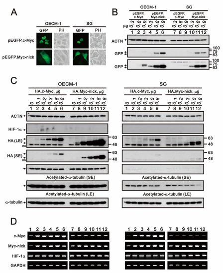 Because we detected expression of HIF-1α and c-Myc in OECM-1 cells, we transfected cells with full-length and nick truncated c-Myc pSG5.HA and pEGFP expression vectors to determine whether c-Myc is involved into the regulation of HIF-1α expression (Figure 12). We observed that while full-length c-Myc was localized in the nucleus, nick truncated c-Myc was in the cytosol (Figure 12A). The expression level of nick truncated c-Myc protein was higher than full-length c-Myc protein (Figure 12B,C). Expression of both c-Myc proteins was higher in OECM-1 than SG cells. The levels of exogenously transfected DNA were confirmed using RT-PCR (Figure 12D). Previous studies demonstrated that nick truncated c-Myc may induce acetylation of cytosolic α-tubulin [34,35]. However, we detected no change the levels of acetylated α-tubulin in OECM-1 cells and a decrease in SG cells. Neither c-Myc protein had an apparent effect on the expression of HIF-1α mRNA or protein, which suggests c-Myc may not be the major transcription factor governing HIF-1α expression in OECM-1 and SG cells.