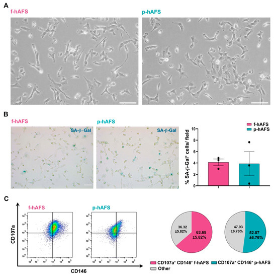 Fetal hAFS and perinatal hAFS phenotypic evaluation. (A) Representative images of fetal hAFS (f-hAFS, left panel) and perinatal hAFS (p-hAFS, right panel) cultured in vitro in standard conditions; scale bar: 200 µm. (B) Analysis of the senescent marker beta-galactosidase (SA-β-Gal, in blue) via cytochemistry staining on f-hAFS and p-hAFS after 5 passages in culture; representative images are reported in the left panel, scale bar: 200 µm. The corresponding percentage of β-Gal-positive cells/field is reported in the graph in the right panel (f-hAFS: 4.12 ± 0.58% and p-hAFS: 3.88 ± 2.10%; p = 0.1424, n = 3 experiments). (C) Immunophenotype of hAFS expressing CD146 and CD107a mesenchymal markers. Representative flow cytometry plots of f-hAFS and p-hAFS (left panel) and corresponding values referred to double positive CD107a+ CD146+ cells; CD107a+ CD146+ f-hAFS: 63.68 ± 5.82%, * p = 0.016 compared to remaining 36.32 ± 5.82% f-hAFS (Other); CD107a+ CD146+ p-hAFS: 52.07 ± 6.76% with remaining 47.93 ± 56.76% p-hAFS (Other); CD107a+ CD146+ f-hAFS vs CD107a+ CD146+ p-hAFS p = 0.2403, n = 4 experiments. Other: total amount of remaining CD107a− CD146− hAFS, CD107a− CD146+ hAFS and CD107a+ CD146− hAFS. All values are expressed as mean ± s.e.m of independent experiments. SA-β-Gal: Senescence-Associated-β-galactosidase.