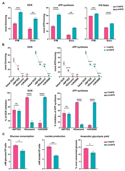 To evaluate whether gestational stage may influence hAFS mitochondrial metabolism, f-hAFS and p-hAFS were analyzed in standard in vitro culture conditions by biochemical analyses. Evaluation of aerobic metabolism showed that the oxygen consumption rate (OCR) and ATP synthesis were lower in f-hAFS with respect to p-hAFS, both when stimulated with pyruvate + malate (P/M; *** p < 0.001 for OCR, and **** p < 0.0001, for ATP synthesis), and with succinate (** p < 0.01 for OCR and ATP synthesis, Figure 2A). Moreover, f-hAFS displayed a lower oxidative phosphorylation efficiency when compared to p-hAFS, as shown by the p/O values (*** p < 0.001 for P/M and **** p < 0.0001 for succinate). Values for f-hAFS were lower than those reported in literature [48], and suggest uncoupling between oxygen consumption and ATP production (Figure 2A). By evaluating the relative contributions of glutamine, long-chain fatty acid oxidation, and glucose in oxidative phosphorylation (OxPhos) metabolism, we noticed that f-hAFS were sensitive to the addition of BPTES (glutaminase inhibitor, ** p < 0.01) and etomoxir (carnitine palmitoyl-transferase 1A inhibitor, ** p < 0.01), but not to UK5099 (mitochondrial pyruvate carrier inhibitor). By contrast, BPTES (**** p < 0.0001) and UK5099 (*** p < 0.001), but not etomoxir, inhibited the metabolism of p-hAFS (Figure 2B, upper panel). This observation was confirmed by the inhibition percentage of the single inhibitor (Figure 2B, lower panel). Therefore, both cell types similarly rely on glutamine as a respiratory substrate; yet, f-hAFS prefer fatty acids as a second substrate, while p-hAFS are sustained by glucose. Interestingly, f-hAFS showed a higher increment of glucose consumption and lactate release when compared to p-hAFS (* p < 0.05 and *** p < 0.001 respectively, Figure 2C), which indicates the attempt to balance inefficient aerobic metabolism by lactate fermentation. This difference could also explain the reaction of f-hAFS to the addition of etomoxir and UK5099. Since f-hAFS favor the use of glucose during anaerobic glycolysis (* p < 0.05), they are likely forced to use fatty acids and glutamine to supply the aerobic metabolism.