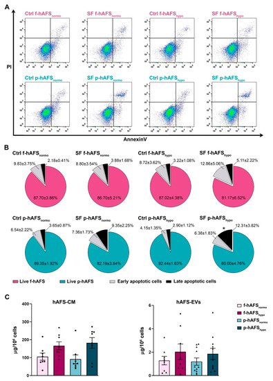 In order to define hAFS secretome formulations, cells were cultured in serum-free conditions to avoid any contamination from FBS. We previously showed that 24 h serum-free (SF) and 1% O2 hypoxic culture conditions did not significantly alter the viability of II trimester fetal hAFS (f-hAFS), while they supported the release of regenerative paracrine factors in their cell-conditioned medium (hAFS-CM) and in extracellular vesicles (hAFS-EVs) [34,35,37,49]. Herein, in addition to profiling the p-hAFS secretome fractions for the first time, we evaluated whether p-hAFS presented similar behavior under the same preconditioning regime, using the normoxic culture condition as the control. f-hAFS and p-hAFS viability was analyzed after 24 h in the following settings: normoxic (20% O2) condition in complete control (Ctrl) culture medium (Ctrl f-hAFSnormo and Ctrl p-hAFSnormo), normoxic condition in SF medium (SF f-hAFSnormo and SF p-hAFSnormo), hypoxic (1% O2) condition in complete control medium (Ctrl f-hAFShypo and Ctrl p-hAFShypo), and hypoxic condition in SF medium (SF f-hAFShypo and SF p-hAFShypo, Figure 3A). We confirmed that f-hAFS viability was unaltered in both Ctrl and SF conditions and under hypoxic stimulation, with more that 80% (up to almost 88%) of total cells being unaffected. Early and late apoptotic cells ranged from ca. 13% to 18% in SF conditions, without any statistically significant relevance. Likewise, perinatal hAFS viability was in the range of 80–92%, and early and late apoptotic cells represented up to 18% in SF conditions. p-hAFS were marginally influenced only under the combined hypoxic and SF conditions; indeed, while preconditioning did not influence cell survival when p-hAFS were cultured in complete medium, the corresponding SF condition showed an increase by ca. 4-fold (* p < 0.05) of late apoptotic cells (Figure 3B).