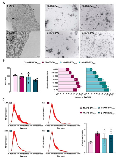 Transmission electron microscopy (TEM) analysis was performed on a Hitachi TEM microscope (HT7800 series, Hitachi High Technologies, Monza, Italy). Digital images were taken with a Megaview 3 camera and Radius software (EMSIS, Muenster, Germany). f-hAFS and p-hAFS were fixed in 3.7% paraformaldehyde (PFA) solution diluted 1:1 with hAFS complete medium, washed in 0.1 M cacodylate buffer, and then immediately incubated for 1 h at room temperature in 0.1 M cacodylate buffer containing 2.5% glutaraldehyde (Electron Microscopy Science, Hatfield, PA, USA). Cells pellets were post-fixed in osmium tetroxide for 1h and in a 1% uranyl acetate solution for 1 h. Samples were dehydrated for 24 h at 42 °C and 48 h at 60 °C through a graded ethanol series and embedded in epoxy resin (Poly-Bed; Polysciences Europe GmbH, Minneapolis, Germany). Ultrathin sections (50 nm) were cut with Leica Ultracut microtome (Leica Microsystems, Milan, Italy) and counterstained with a 5% uranyl acetate in 50% ethanol solution. f-hAFS-EVs and p-hAFS-EVs were resuspended in 20 μL PBS solution and fixed by adding an equal volume of 2% paraformaldehyde in 0.1 M phosphate buffer solution (pH 7.4). EVs were then adsorbed for 10 min onto formvar-carbon coated copper grids by floating the grids on 5 μL drops on parafilm. Subsequently, grids with adhering EVs were rinsed in PBS and negatively stained by 2% uranyl acetate solution for 5 min at room temperature. Stained grids were embedded in 2.5% methylcellulose for improved preservation and air dried before examination. Morphometry analysis of hAFS-EVs was measured on 10 randomly taken micrographs at 40.000× g magnification. Size was calculated using the arbitrary line function embedded the measurement dialog box of Radius software (EMSIS, Muenster, Germany). To visualize hAFS-EVs size distribution, results were plotted as scatter dot plot and as frequency distribution in which each size is represented as a point along with lines for the median value and the range.