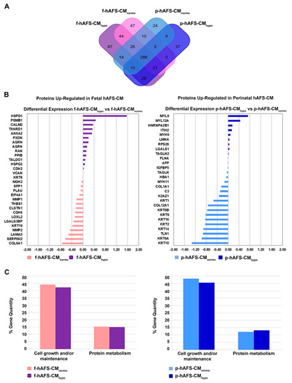 Comparative proteomics analysis of fetal- and perinatal hAFS-CM. (A) Venn diagram illustrating the distribution of proteins found with a frequency of at least 2 within f-hAFS-CMnormo (pink), f-hAFS-CMhypo (purple), p-hAFS-CMnormo (light blue) and p-hAFS-CMhypo (blue). (B) Differentially expressed proteins identified in fetal hAFS-CM (left panel) and perinatal hAFS-CM (right panel) by label-free quantification with MAProMa software. Left panel: histogram plot refers to the differential expression between normoxic control (pink bars and negative DAveDAve values) and hypoxic (purple bars and positive DAve values) condition of proteins found up-regulated in f-hAFS-CM over p-hAFS-CM. Right panel: histogram plot reporting the differential expression between normoxic control (light blue bars and negative DAve values) and hypoxic (blue bars and positive DAve values) condition of proteins found upregulated in p-hAFS-CM over f-hAFS-CM. Proteins with DAve (ratio of protein expression) ≥ |0.4| and a DCI (confidence of differential expression) ≥ |5| passed the filters and were considered differentially expressed. For each protein, gene name and related DAve value are reported; see Table S2 for the complete list and detailed parameters of the reported proteins. (C) Biological processes enrichment analysis of proteins identified with a frequency of at least 2 in fetal hAFS-CM (left panel) and perinatal hAFS-CM (right panel) according to cell hypoxic preconditioning. Based on FunRich tool, gene ontology terms are shown in bar charts reporting the percentage of genes enriched for each category (pink bars for f-hAFS-CMnormo, purple bars for f-hAFS-CMhypo, light blue bars for p-hAFS-CMnormo and blue bars for p-hAFS-CMhypo). Only gene ontology terms with Bonferroni corrected with * p < 0.05 are reported.