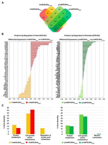 Comparative proteomics analysis of fetal- and perinatal hAFS-EVs. (A) Venn diagram illustrating the distribution of proteins identified with a frequency of at least 2 within f-hAFS-EVsnormo (dark yellow), f-hAFS-EVshypo (red), p-hAFS-EVsnormo (light green) and p-hAFS-EVshypo (dark green). (B) Differentially expressed proteins identified in fetal hAFS-EVs (left panel) and perinatal hAFS-EVs (right panel) by label-free quantification with MAProMa software. Left panel: histogram reporting the differential expression of proteins found upregulated between normoxic control (dark yellow bars and negative DAve values) and hypoxic preconditioning (red bars and positive DAve values) of f-hAFS-EVs over p-hAFS-EVs. Right panel: histogram reporting the differential expression of proteins found upregulated between control normoxic (light green bars and negative DAve values) and hypoxic preconditioning (dark green bars and positive DAve values) of p-hAFS-EVs over f-hAFS-EVs. Proteins with DAve (ratio of protein expression) ≥ |0.4| and a DCI (confidence of differential expression) ≥ |5| passed the filters and were considered differentially expressed; see Table S3 for the complete list and detailed parameters of the reported proteins. (C) Biological processes enrichment analysis of proteins identified with a frequency of at least 2 in f-hAFS-EVs (left panel) and p-hAFS-EVs (right panel) after hypoxic preconditioning. Based on FunRich tool, gene ontology terms are shown in bar charts reporting the percentage of genes enriched for each category (dark yellow bars for f-hAFS-EVsnormo, red bars for f-hAFS-EVshypo, light green bars for p-hAFS-EVsnormo and dark green bars for p-hAFS-EVshypo). Only gene ontology terms with Bonferroni corrected * p < 0.05 are reported.