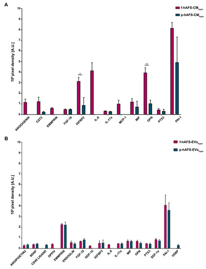 Cytokine and chemokine profiling within fetal- and perinatal hAFS secretome formulations. (A) Expression of cytokines and chemokines detected within the hypoxic fetal- versus perinatal hAFS-CM (f-hAFS-CMhypo vs p-hAFS-CMhypo) are reported in pixel density by arbitrary unit [A.U.]. Values are expressed as mean ± s.e.m of n = 3 independent experiments and reported in Table S4; * p = 0.0485; ** p = 0.006. (B) Cytokine and chemokine content detected in the hypoxic fetal- versus perinatal hAFS-EVs (f-hAFS-EVshypo vs p-hAFS-EVshypo) and expressed by pixel density in arbitrary units [A.U.]. Values are expressed as mean ± s.e.m of n = 3 independent experiments and reported in Table S5. CST3: Cystatin C; EMMPRIN: Extracellular Matrix MetalloPRoteinase Inducer; FGF-19: Fibroblast Growth Factor-19; IGFBP2: Insulin-like Growth Factor (IGF) Binding Protein 2; IL-8: Interleukin-8; IL-17a: Interleukin-17a; MCP-1: Monocyte Chemoattractant Protein-1; MIF: Macrophage migration Inhibitory Factor; PTX3: Pentraxin 3; PAI-1: Plasminogen Activator Inhibitor-1; BDNF: Brain-Derived Neurotrophic Factor; DPPIV: DiPeptidyl Peptidase IV; GDF-15: Growth Differentiation Factor-15; IGFBP3: Insulin-like Growth Factor (IGF) Binding Protein 3; SDF-1α: Stromal Derived Factor-1 alpha; VDBP: Vitamin D-Binding Protein.