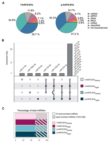 RNA cargo profiling of fetal- and perinatal hAFS-EVs. (A) Relative percentage distribution of RNA types detected within fetal- vs perinatal hAFS-EVs (f-hAFS-EVs and p-hAFS-EVs, respectively). Slice of pie chart referring to average percentage of RNA amount in f-hAFS-EVs (left panel) and p-hAFS-EVs (right panel) of n = 3 experiments. (B) Upset plot of miRNAs enriched in hAFS-EVs according to gestational stage and cell preconditioning. (C) The 15 most enriched miRNAs within f-hAFS-EVsnormo (64.47 ± 0.28%), f-hAFS-EVshypo (63.84 ± 0.43%); p-hAFS-EVsnormo (64.08 ± 0.92%) and p-hAFS-EVshypo (65.78 ± 2.82%); values are expressed as mean percentage ± s.e.m of n = 3 experiments.