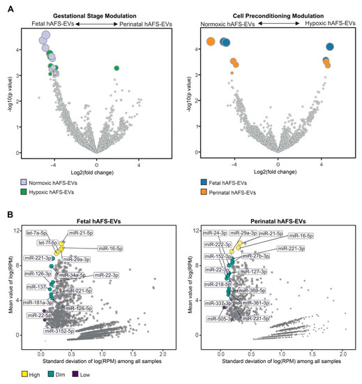 Analysis of differential enrichment of miRNAs in fetal- and perinatal hAFS-EVs. (A) Volcano plots for differential enrichment of hAFS-EV miRNA cargo according to gestational stage (left panel) and in vitro hypoxic preconditioning of secreting cells (right panel). For miRNA details, please refer to Table 1. (B) Scatter plot of the correlation between variability (X axis) and enrichment level (Y axis) of stable miRNAs within fetal hAFS-EVs (left panel) and perinatal hAFS-EVs (right panel) according to high (yellow dots), dim (green dots) and low (dark purple dots) enrichment. For miRNA details, please refer to Table 2. RPM: reads per million.