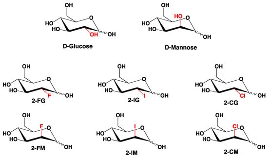 2-Deoxy-D-glucose (2-DG) is a synthetic analogue of D-glucose in which a hydroxyl group at C-2 is replaced by a hydrogen atom. Since D-glucose and D-mannose are C-2 epimers and in consequence their deoxygenation at C-2 would produce the same compound, the 2-DG should also be considered an analogue of D-mannose [] (Figure 1). A significant number of halogen-substituted carbohydrates have been synthesized. Some of them, the fluorine derivatives, were extensively tested, and 2-deoxy-2-fluoro[18F]-D-glucose has been used in medicine as an imaging agent for positron emission tomography (PET) [,]. Other halogen derivatives have been initially considered as potentially useful intermediates in synthetic carbohydrate chemistry [], and only later considered and tested as potential biologically active agents [,]. A significant scientific effort has recently been allocated to develop new drugs targeting cancer metabolism, particularly glucose metabolism, which differs from glucose processing in normal cells [,]. 2-DG is considered a promising anticancer drug targeting glucose metabolism of cancer cells [,], including melanoma [], osteosarcoma [], and others. Its proposed mechanism of action relies on the inhibition of some key enzymes involved in glucose and mannose metabolism. One of those enzymes is hexokinase (HK), responsible for glucose phosphorylation in the first step of glycolysis. HK inhibition leads to significant impairment of glucose metabolism. The other route to disrupt the homeostasis of cancer cells by 2-DG relies on alteration of protein glycosylation and disruption of signaling pathways []. Previous studies demonstrated potential antiviral properties of 2-DG [,]. More recent computational studies suggested that 2-DG and its derivatives can block viral proteases, which render the virus unable to bind to its receptor []. In summary, so far in addition to 2-DG, only 2-deoxy-2-fluoro-D-glucose (2-FG) has been recognized as a potential anticancer compound in cancer therapy [,]. Other halogen derivatives of 2-DG were not extensively investigated. Studies comparing different halogen analogues directly with 2-DG have been initiated by us [] and these studies and our more recent preliminary data (not published) suggest that other 2-DG derivatives should also be considered as potentially useful agents in the treatment or diagnoses of metabolically dependent diseases.