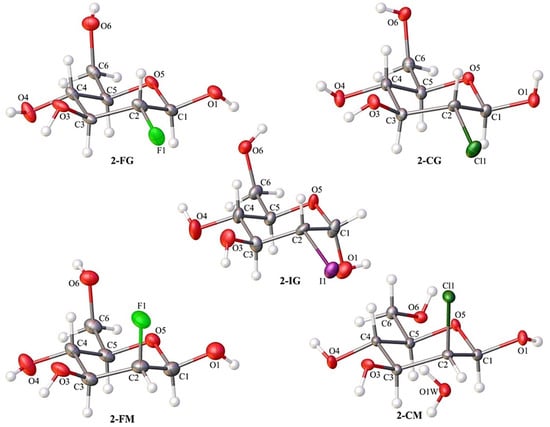 Despite the potential medical significance of 2-DG derivatives, only a few crystal structures of high quality are available in crystallographic databases (including the parent compound) []. This possibly is due to significant difficulties in the preparation of high-quality crystals. Most carbohydrates tend to form amorphic solids, often containing residual solvent. Most of the existing structures are polyfluorinated pyranoses, which are easier to crystallise due to a reduced number of hydroxyl groups [,,]. There is one structure of 2-FG deposited in the CSD database (deposition number 1296336); however, it has only moderate quality. To our best knowledge, no comprehensive structural study investigating the effects of substitution by different halogens at a given position in the pyranose ring has been conducted. A better understanding of the structural features of this class of carbohydrates, both in the solid state and solution, is necessary to achieve an in-depth knowledge of their biological and pharmacological properties. It should be noted that there have been several experimental preclinical and clinical studies with 2-DG (and its derivatives), mainly administrated orally. Thus, the existence of their potential polymorphs may have profound medical implications because different crystal forms usually are characterized by different bioavailability [,].