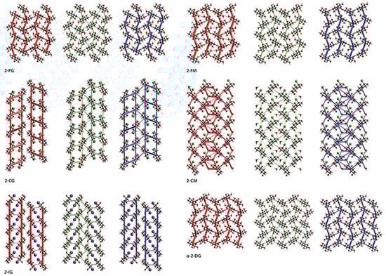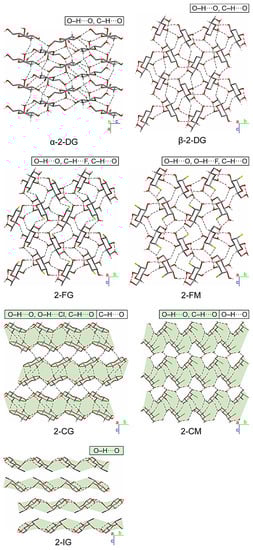 The substitution of the pyranose C2-atom by halogen atoms of various sizes has a noticeable impact on the supramolecular landscape. The significance of changes concerning the mutual arrangement of molecules and the scheme of intermolecular interactions occurring in their crystals is different for individual compounds. However, some general trends can be noticed. In the case of both fluoro derivatives (2-FG and 2-FM), the changes are relatively subtle. A closer look (Figure 4) reveals β-2-FG and β-2-FM molecules are organized in their crystals almost identically to the β-anomer of 2-DG (β-2-DG) []. Moreover, all three compounds display nearly the same unit cell parameters. This isostructurality results from the relatively small size of the fluorine atom, which is often regarded, when connected to carbon, as an isostere of hydrogen. The existence of such a phenomenon also has been reported for other fluorinated organic systems [,]. Differences between the crystal structures of β-2-DG, β-2-FG, and β-2-FM become more apparent after a detailed examination of each structure’s existing scheme of interactions. Sugar molecules are assembled in complex 3D-frameworks, in which a dense network of hydrogen bonds is present.