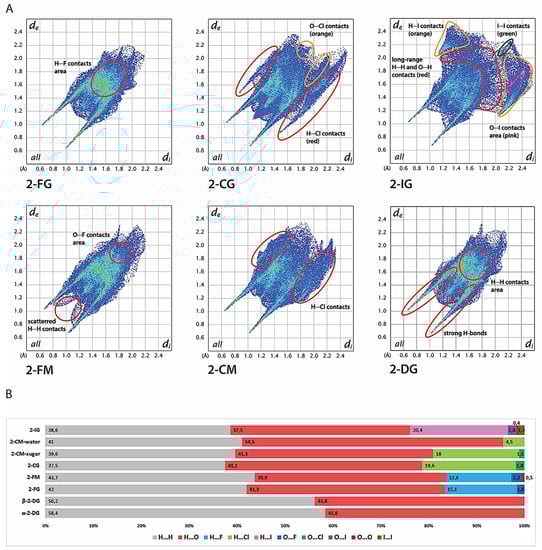 The shapes of fingerprint plots for 2-DG and its fluorine derivatives bear a strong resemblance, mirroring their isostructural crystal lattices. The only discernible difference among those compounds is the presence of scattered, medium-range (di + de > 2.3 Å) H···H contacts in 2-FM. Otherwise, the patterns of H···H contacts overlap each other in both F-derivatives and do not differentiate from the H···H contact pattern in both anomers of 2-DG. These observations are in line with the literature showing that, in general, fluorine is considered to be a good mimic of hydrogen in the crystalline state. Both 2-FG and 2-FM form several medium-range H···F contacts scattered in the center of the fingerprint and overlapping with H···H contacts. The presence of secondary “spikes” of H···Cl contacts in the fingerprint plot for 2-CG indicates the presence of relatively strong O-H···Cl bonding between sugar molecules, and the edges of the spikes are around dH···Cl ≈ 2.3 Å. This feature is less pronounced in the case of 2-CM, where H···Cl interactions are significantly longer and the shortest H···Cl contacts are around 2.8 Å. The shape of the fingerprint for a water molecule in 2-CM confirms strong O-H···O bonding, and only a minimal contribution of H···Cl contacts.