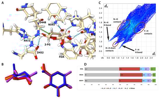 Using a different approach to study ligand-protein interaction for all structures, we generated HS and fingerprint plots for 2-FG bound in the catalytic centre (Figure 7, Figures S4 and S5). We included the same residues that were discussed in the previous paragraph (Table 3). The distributions of interatomic contacts are the same for each structure (Figures S4 and S5), showing that one or two single substitutions have negligible effects on the interaction patterns, hence the following discussion concerns all studied complexes. A fingerprint plot for the 3K4L structure is depicted in Figure 6C; the pattern of contacts is similar when compared to the crystalline state (see Figure S4). The main difference is a high number of long-range interactions in the protein complex caused by the less dense packing and the removal of water molecules before interaction energy calculations. Otherwise, the shapes of the fingerprint are very alike in both instances because the most important contributions come from H-bonding and H···H short contacts. The nature of H-bonds in the complex (rendered as a dotted line in Figure 6B) stemmed from different chemical compositions of the adjacent residues (see Table S30 for details). In three H-bonds, the donors are within the 2-FG molecule (O1, O3, and O4) and interact with the COO- group of D452, C=O group of V546, and nitrogen atom from the histidine ring of H548, respectively. The O3 atom in FG-2 is an acceptor of an H-atom belonging to the NH2 group of N593. Interestingly, a fluorine atom is involved in H-bonding, acting as an acceptor of an H atom from the NH2 group of Q448. This H-bond was not recognized in the previous literature, and its existence explains the relatively high contribution of Q448 to the total interaction energy. Due to the presence of strong N-H hydrogen bonds, the percentage of N···X contacts between 2-FG and its surroundings is relatively high, and the contribution of O···H contacts is reduced if compared to the solid-state crystalline structure. Another difference is a higher contribution of H···H contacts in the complex, which is mostly caused by the presence of H-rich aliphatic fragments and aromatic rings in the vicinity of the ligand.
