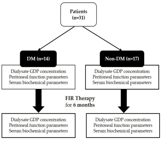 Because of limited literature about the effects of FIR on peritoneal function and the concentration of dialysate GDPs in diabetic patients, the purpose of this study is to investigate the effect of FIR therapy on the dialysate concentration of GDPs and clinical data of PD patients with and without DM.