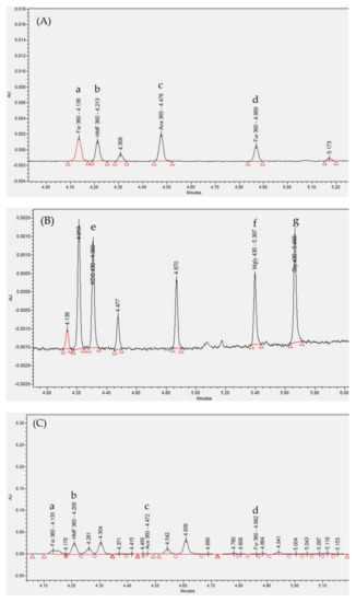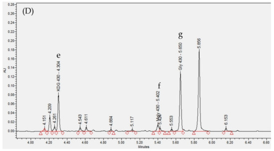 The chromatograms of GDP-DNPH using the ultra-performance liquid chromatography photodiode array (UPLC-PDA) detector are shown in Figure 2. The identification of GDPs in the dialysate was based on the comparison of UPLC retention time and UV spectra of the standards. Formaldehyde-DNPH (a), HMF-DNPH (b), acetaldehyde-DNPH (c), and furfural-DNPH (d) were detected at 360 nm. KDG-bis-DNPH (e), methylglyoxal-bis-DNPH (f), and glyoxal-bis-DNPH (g) were detected at 430 nm. The linear range and coefficient of determination (r2) of each GDP-DNPH hydrazone calibration curve are listed in Table 2. The retention time of the GDP-DNPH in the dialysate corresponded to that of the calibration standard with a tolerance of ±0.1 min [40]. The r2 of calibration curves was at least 0.996.