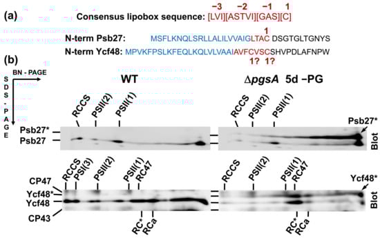 During oxygenic photosynthesis, photosystem II (PSII) and photosystem I (PSI) complexes utilize light to extract electrons from water to produce the NADPH and ATP needed for CO2 fixation and the synthesis of sugars. The biogenesis of both complexes requires an array of auxiliary protein factors that generally optimize the process, enable the correct binding of cofactors, and protect the assembly intermediates from photodamage [,,,]. Among them, a group of PSII-specific factors including Psb27 [], CyanoP [,], and CyanoQ [,] are typical bacterial lipoproteins (for a review, see [,,]) that bind to the lumenal side of the cyanobacterial thylakoid membrane to stabilize PSII assembly intermediates. Lipoproteins are synthesized as preproteins with a signal peptide targeting them into the lumen. The signal peptide is cleaved within a conserved motif of [LVI]−3 [ASTVI]−2 [GAS]−1 [C]1, where [C]1 designates the starting cysteine (C) residue of the apoprotein (Figure 1a). This four-residue motif is called the lipobox and is conserved in eubacteria. Prior to cleavage of the signal peptide, the SH group of [C]1 is modified by the attachment of a diacylglycerol moiety, which is transferred from phosphatidylglycerol (PG) by preprolipoprotein diacylglyceryl transferase (for a review, see []). Finally, the signal peptide is cleaved N-terminal of [C]1 by signal peptidase II and the released NH2 group of [C]1 is acylated using lipoprotein N-acyltransferase [].