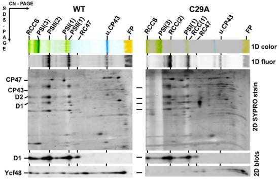 For native electrophoresis in the first dimension, isolated cellular membranes were solubilized with β-DDM (ratio to Chl = 60 (w/w)) and then separated using blue native [] or clear native [] polyacrylamide gel electrophoresis (BN/CN-PAGE) on a 4–12% (w/v) gradient gel. Individual components of the protein complexes were resolved by incubating the native gel strip in a Tris-HCl buffer (pH 7) containing 1% (w/v) sodium dodecyl sulfate (SDS) and 1% (w/v) dithiothreitol (DTT) for 30 min at room temperature, and proteins were separated in the second dimension by SDS-PAGE in a denaturing 12–20% polyacrylamide gel containing 7 M urea []. For standard single dimension SDS-PAGE, membrane proteins were solubilized with 1% (w/v) SDS and 2% (w/v) DTT for 30 min at room temperature before loading onto the gel. Proteins were either stained with Coomassie blue, or by Sypro Orange. In the latter case, they were subsequently electroblotted onto a polyvinylidene difluoride membrane. Membranes were incubated with specific primary antibodies and then with a secondary antibody conjugated with horseradish peroxidase (Sigma-Aldrich, St. Louis, MI, USA). The following primary antibodies were used in the study: anti-Ycf48 raised in rabbit against recombinant Synechocystis Ycf48 []; anti-Psb27, anti-CP47, anti-CP43, and anti-D1 [].