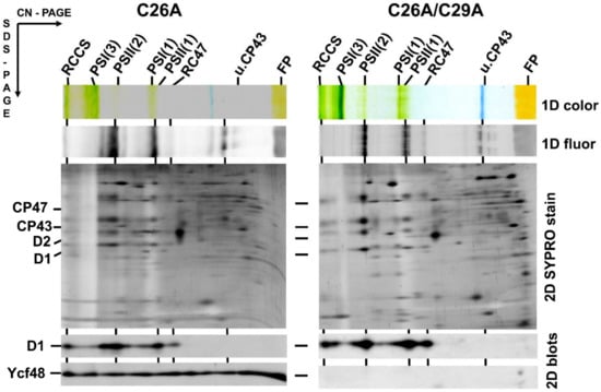 Content of YCF48 in isolated membranes of the Synechocystis C26A mutant and C26A/C29A double mutant. Membrane proteins were separated by 2D CN/SDS-PAGE, and after the first dimension, the gel was photographed (1D color) and scanned for Chl fluorescence (1D fluor). After the separation in the second dimension, the gel was stained by Sypro Orange (2D SYPRO stain), blotted to a polyvinylidene difluoride membrane, and immunodecorated using antibodies against D1 and Ycf48 (2D blots). Designation of complexes as in Figure 1 and Figure 2. Five micrograms of Chl were loaded for each sample.