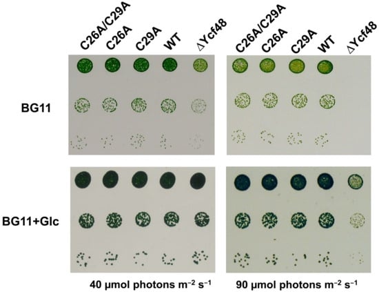 Growth of wild type (WT), C mutants, and Ycf48-less mutant on agar plates under autotrophic (BG11) and photoheterotrophic (BG11+Glc) (40 µmol photons m−2 s−1) conditions at growth (40 µmol photons m−2 s−1) and increased (90 µmol photons m−2 s−1) irradiance. The growth assay was performed as described in [].