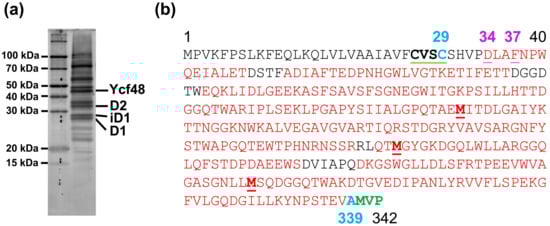 Electrophoretic analysis of the preparation isolated from the strain expressing His-D2 and lacking CP47 (a) and sequence of the Ycf48 with designated crucial residues and coverage obtained by its MS bottom–up analysis (b). (a): The preparation was analyzed by SDS-PAGE, and after staining with Coomassie, the bands of Ycf48, D2, and both forms of the D1 protein were identified using MS. (b): The part of Ycf48 sequence identified after in-gel digestion using chymotrypsin and/or Asp-N protease is depicted in red letters. The designated amino acid residues are: (i) C29 residue (in blue) assumed to be the initial C residue of the putative lipoprotein; (ii) D34 residue (numbered and underlined in violet) identified as the most N-terminal residue in the Asp-N fragments; (iii) F37 residue (numbered and underlined in violet) annotated as the initial protein residue in SwissProt (P73069); M151, M288, and M224, cleavage sites by cyanogen bromide (in bold and underlined), and (iv) A339 residue (in blue) as the last residue found in the both chymotrypsin and Asp-N fragments. The non-canonical lipobox CVSC is designated with bold letter and green underline, putative cleaved MVP sequence is in green.