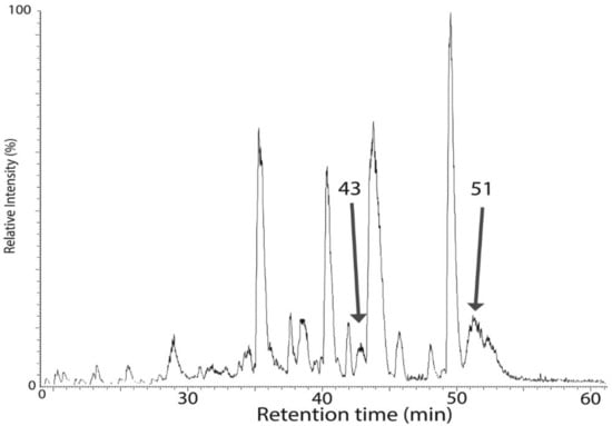 To obtain more detailed information about the nature of Ycf48 post-translational modification (PTM), we used a top–down approach in combination with high-resolution MS analysis. For this purpose, the whole His-D2 preparation was analyzed using reversed-phase chromatography and the eluted proteins were subjected to high-resolution MS identification. The chromatogram (Figure 6) consisted of a large number of peaks, with the peak eluting at 51 min and showing an average mass of 34,689.12 Da ascribed to Ycf48 after peak collection and bottom–up analysis of its components. However, the determined mass did not agree with the predicted mass based on a single cleavage of the signal peptide at F36. Instead, the difference of 815 Da between the predicted and measured masses of Ycf48 (Table 1) is consistent with cleavage of Ycf48 after the A339 residue (to remove the last three residues) and before the C29 residue, and subsequent modification of the SH group of C29 with diacylglycerol and acylation of the NH2-group.