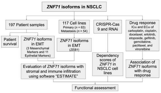Epithelial-to-mesenchymal transition (EMT) is a highly dynamic process in which epithelial cells can convert to a mesenchymal phenotype. EMT is also reversible by the mesenchymal-to-epithelial transition (MET). Emerging evidence reveals the involvement of EMT in tumor progression, metastasis, and resistance to cancer treatment [15,16,17,18]. However, the involvement of EMT in cancer patient outcomes remains controversial [19]. Recent studies have evaluated EMT as well as stromal and immune infiltration in tumors using transcriptional profiles [19,20,21]. This study sought to investigate the expression of ZNF71 KRAB and KRAB-less isoforms in NSCLC tumors and cell lines and their association with patient outcome and chemotherapeutic response. Tripartite motif containing 28 (TRIM28) protein, a universal co-factor for KRAB-ZFP transcription factors [22], contributes to EMT and might be important for tumor metastasis in lung cancer [23]. Based on the link between KRAB-ZFPs and EMT [24], this study sought to explore whether NSCLC tumors with different EMT characteristics have a distinct survival outcome and the association of ZNF71 isoforms and EMT. Molecular functions of ZNF71 in NSCLC proliferation were evaluated with CRISPR-Cas9 and RNAi approaches. The overall study scheme is provided in Figure 1.