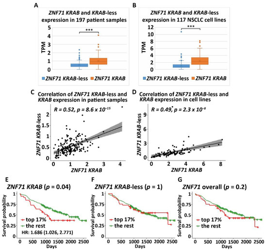 Zinc finger protein 71 Krüppel associated box (ZNF71 KRAB) and KRAB-less expression non-small-cell lung cancer (NSCLC) patient tumors and cell lines (A). Comparison of the expression of ZNF71 KRAB and KRAB-less isoforms in NSCLC tumors (*** p < 0.001, two-sample t-tests). (B) Comparison of the expression of ZNF71 KRAB and KRAB-less isoforms in NSCLC cell lines (*** p < 0.001, two-sample t-tests). (C) Pearson’s correlation of the expression of ZNF71 KRAB and KRAB-less isoforms in patient tumors. (D) Pearson’s correlation of the expression of ZNF71 KRAB and KRAB-less isoforms in cell lines. (E–G) Kaplan–Meier survival analyses of patient tumors grouped by ZNF71 KRAB isoform expression (E), ZNF71 KRAB-less isoform expression (F), and ZNF71 overall expression (G), with top 17% expression versus the rest, respectively. When ZNF71 KRAB was expressed higher than transcripts per million (TPM) of 1.5 (top 17%), the patients survived for a significantly shorter length of time.