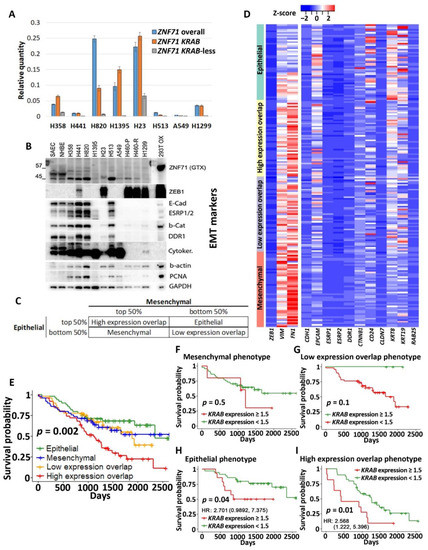 Patients defined by the four EMT phenotypes had significantly different disease-specific survival (log-rank p<0.01, Kaplan–Meier analysis). The patients in the High expression overlap group had the worst prognosis, with the shortest survival time, whereas the patients in the Epithelial group had the best prognosis, with the longest survival time (Figure 3E). The four EMT phenotypes were independent of patient cancer stage (p = 0.8569, chi-square tests; Table A2). The EMT phenotype was associated with ZNF71 KRAB expression (p = 0.0099, chi-square tests; Table A3). Within each EMT phenotype, we further performed a Kaplan–Meier survival analysis for the high ZNF71 KRAB isoform expression group (TPM ≥ 1.5) versus the low ZNF71 KRAB isoform expression group (TPM < 1.5) to assess the association of ZNF71 KRAB expression and patient survival in each EMT phenotype. In Epithelial and High expression overlap phenotypes, patients with higher KRAB expression had a significantly lower survival probability than those with lower KRAB expression (Figure 3H,I). In the Mesenchymal and Low expression overlap phenotypes, there was no significant difference in patient survival between the high and low KRAB expression groups (Figure 3F,G). In the Mesenchymal group, tumors with higher ZNF71 KRAB expression had a worse prognosis (no statistical significance; Figure 3F). In the Low expression overlap group, tumors with higher ZNF71 KRAB expression had a better prognosis (no statistical significance; Figure 3G). These results suggest that the ZNF71 KRAB isoform is a poor-prognosis marker for NSCLC tumors with high expression of epithelial markers but not for NSCLC with low expression of epithelial markers.