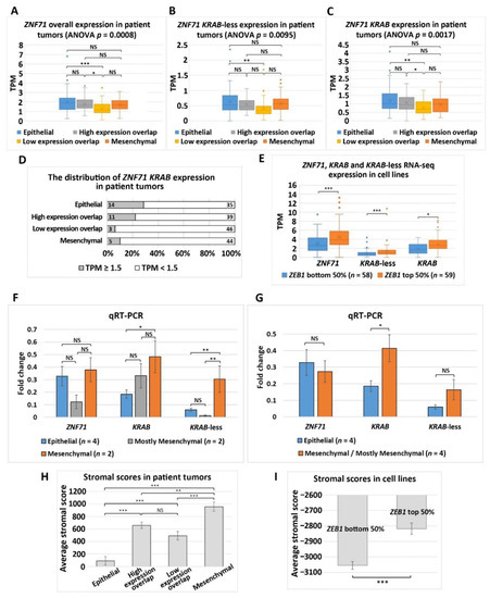 Association of ZNF71 isoforms and EMT in NSCLC tumors and cell lines. (A–C) Comparison of ZNF71 overall (A), KRAB-less isoform (B), and KRAB isoform (C) expression in patient tumors categorized by four EMT phenotypes. (D) Distribution of ZNF71 KRAB expression (TPM ≥ 1.5) versus ZNF71 KRAB expression (TPM < 1.5) in patient tumors defined by four EMT phenotypes. The number of patient samples in each category is provided in the figure. (E) Comparison of ZNF71 overall, KRAB-less, and KRAB expression in NSCLC cell lines categorized by median ZEB1 expression. (F) Fold change of ZNF71 overall, KRAB, and KRAB-less expression in Epithelial, Mesenchymal, and Mostly Mesenchymal NSCLC cell lines in qRT-PCR analysis (individual cell line results displayed in Figure 3A). * p-Value < 0.05, ** p-value < 0.01, and *** p-value < 0.001; NS (non-significance): p-value > 0.05 in ANOVA and Tukey’s tests. (G) Fold change of ZNF71 overall, KRAB, and KRAB-less expression in Epithelial and Mesenchymal/Mostly Mesenchymal (combined) NSCLC cell lines in qRT-PCR analysis. * p-Value < 0.05, ** p-value < 0.01, and *** p-value < 0.001; NS: p-value> 0.05 in two-sample t-tests. (H,I) EMT classifiers in both patient tumors and cell lines were validated by stromal scores quantified with ESTIMATE [20]. (H) Comparison of stromal scores of patient tumors categorized by four EMT phenotypes. (I) Comparison of stromal scores of NSCLC cell lines categorized by median ZEB1 expression.