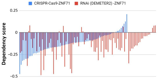 The functional role of ZNF71 in cell proliferation was evaluated in publicly available high-throughput CRISPR-Cas9 (n = 78) and RNAi (n = 92) screening data in NSCLC cell lines. Normalized ZNF71 dependency scores were not significant (below the threshold of –0.5) in the NSCLC cell lines in either RNAi (processed with DEMETER2) or CRISPR-Cas9 (Figure 5), indicating that a knockdown/knockout of ZNF71 did not significantly affect NSCLC tumor cell growth in vitro.