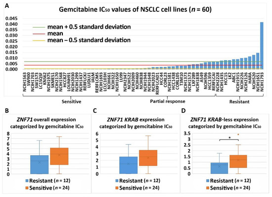 Association of the expression of ZNF71 and its isoform with gemcitabine drug response (IC50) in NSCLC cell lines (n = 60). ZNF71 KRAB-less expression was significantly higher in gemcitabine-sensitive cell lines compared with gemcitabine-resistant cell lines. (A) Gemcitabine IC50 values of NSCLC cell lines. (B–D) Comparison of ZNF71 overall (B), KRAB-less isoform (C), and KRAB isoform (D) expression in cell lines categorized by IC50 values (resistant versus sensitive). * p < 0.05 in two-sample t-tests used in (B–D).