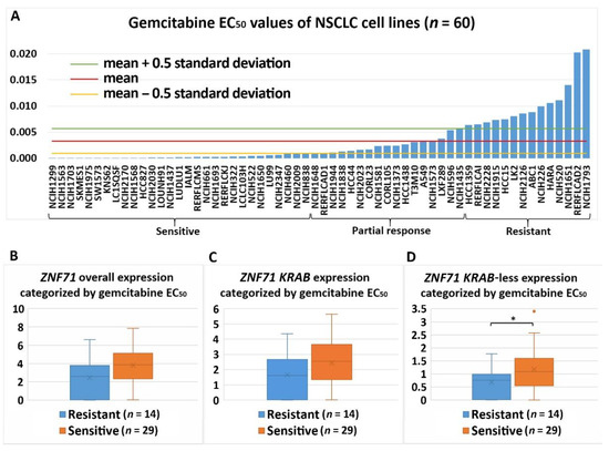 Association of the expression ZNF71 and its isoform with gemcitabine drug response (EC50) in NSCLC cell lines (n = 60). ZNF71 KRAB-less expression was significantly higher in gemcitabine-sensitive cell lines compared with gemcitabine-resistant cell lines. (A) Gemcitabine EC50 values of NSCLC cell lines. (B–D) Comparison of ZNF71 overall (B), KRAB-less isoform (C), and KRAB isoform (D) expression in cell lines categorized by EC50 values (resistant versus sensitive). * p < 0.05 in two-sample t-tests used in (B–D).