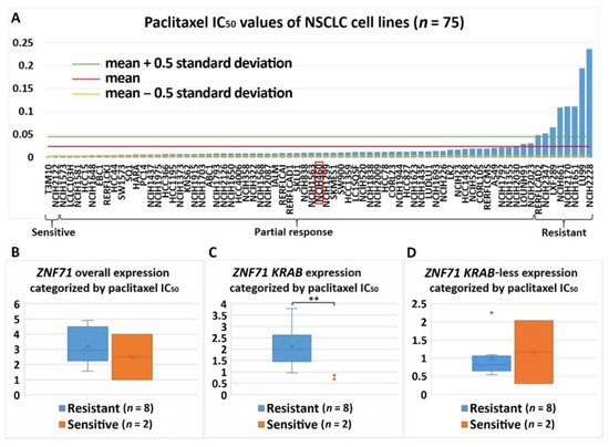 Association of the expression ZNF71 and its isoform with paclitaxel drug response (IC50) in NSCLC cell lines (n = 75). ZNF71 KRAB expression was significantly higher in paclitaxel-resistant cell lines compared with paclitaxel-sensitive cell lines. (A) Paclitaxel IC50 values of NSCLC cell lines. (B–D) Comparison of ZNF71 overall (B), KRAB-less isoform (C), and KRAB isoform (D) expression in cell lines categorized by IC50 values (resistant versus sensitive). ** p < 0.01 in two-sample t-tests used in (B–D).