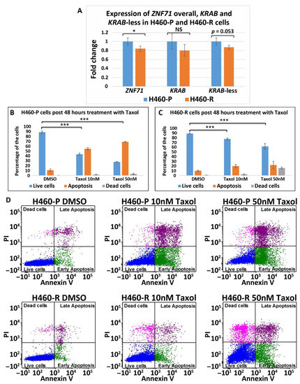 ZNF71 isoforms in paclitaxel-resistant (H460-R) and parental (H460-P) cell lines. (A) Comparison of fold change of ZNF71 overall, KRAB, and KRAB-less expression in H460-P and H460-R cell lines in qRT-PCR experiments. * p < 0.05, *** p < 0.001, NS: non-significance, two-sample t-tests. (B,C) H460-P (B) and H460-R (C) cells were treated either with DMSO or Taxol with the indicated doses. After 48 h, the cells were stained with Annexin V and PI and the percent of live/dead cells was determined by flow cytometry. Error bars represent standard deviation from three biological replicates. A mixed-effect model was used to assess the difference between two conditions, using R package Ime4. The p-value was calculated based on asymptotic Z-distribution. (D) Flow cytometry images for H460-P and H460-R, respectively, after treatment with either DMSO or Taxol.
