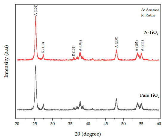 XRD analysis was used to characterize the crystal phase structure of the prepared photocatalytic TiO2. The XRD pattern of N-TiO2, along with the pattern of pure TiO2 used as a reference, is presented in Figure 1. The crystal phase composition of pure TiO2 and N-TiO2 contained a mixture of major anatase phase and minor rutile phase. The XRD profile of N-TiO2 calcined at 350 °C exhibited anatase peaks at 25.25°, 37.68°, 47.94°, 53.87°, and 55.01° and were in good accordance with the (101), (004), (200), (105), and (211) peak position of anatase TiO2 (JCPDS 86-1157) and rutile peaks at 27.4° and 36.03°, which were in conformity with the (110) and (101) peak position of rutile TiO2 (JCPDS 21-1276).
