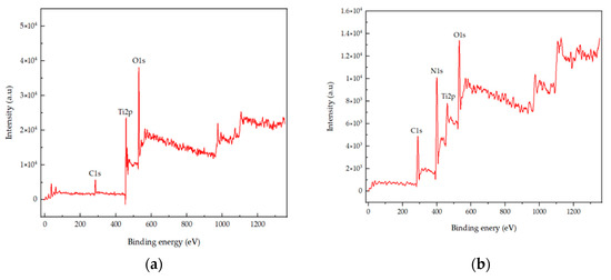 XPS was performed in order to characterize the chemical state and surface composition of the prepared photocatalytic TiO2. The spectrum of pure TiO2 and N-TiO2 is presented in Figure 2a,b, respectively. TiO2 predominantly contained Ti, O, and C elements, while TiO2 upon heat treatment indicated the presence of Ti, O, N, and C elements. Amongst these elements in N-TiO2, the C1s peak was located at 288.6 eV, and it represented the contaminated residual precursor, which was not completely removed during heat treatment. Moreover, accidental carbon during the process may cause the presence of the C element. The N1s peak was found to be at 400.6 eV, while Ti 2p doublets were located at 464.4 and 458.4 eV corresponding to Ti 2p3/2 and Ti 2p1/2, which were approximately in accordance with the actual values. Subsequently, the O1s peak could be fitted into two peaks located at binding energies of 529.8 and 532.05 eV.