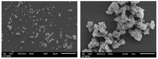 The morphology of doped TiO2 was observed using SEM and is shown in Figure 3. According to the results, N-TiO2 calcinated at 350 °C showed agglomerated clusters with spherical morphology. At high temperatures, particles tend to aggregate due to the particle growth process.
