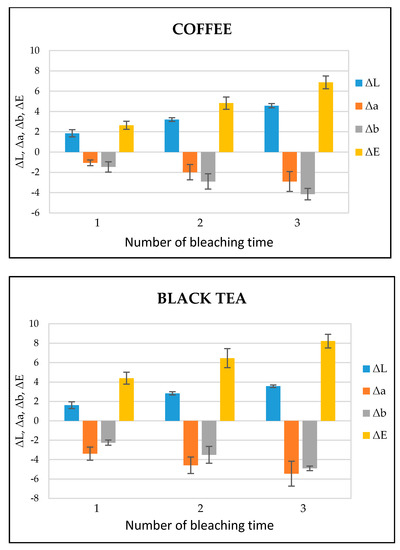 ΔL, Δa, Δb, and ΔE values of coffee- and black tea-stained bovine tooth samples treated with dental bleaching gel (n = 6).