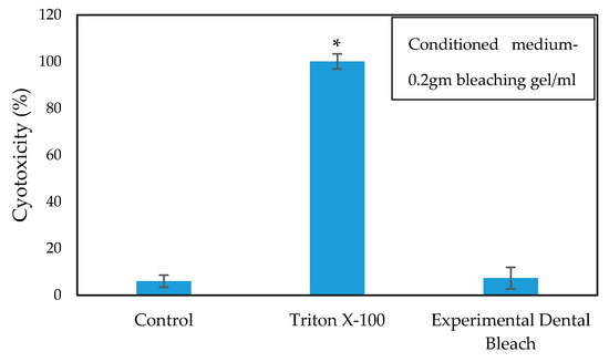 Cytotoxicity of the cells cultured in dental bleach-conditioned medium (n = 6), * p < 0.05 compared to the control group by student t-test.