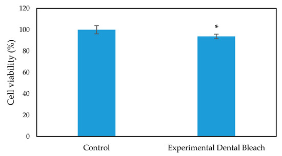 WST-1 assay for 3T3 cell viability evaluation on exposure to dental bleach-conditioned medium (n = 6), * p < 0.05 compared to the control group by student t-test.