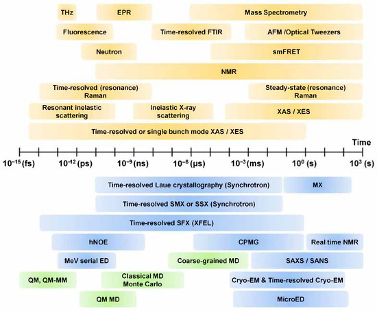 Among these, techniques for obtaining high-resolution structural information are essential as they provide intuitive insights into important structural and functional characteristics of molecules that play important roles in life. Currently, the three dimensional structures of small molecules can be obtained from repositories such as the Cambridge Structural Database (CSD) [1], which contains 1,123,962 small-molecule organic or metal-organic structures obtained using X-ray, neutron diffraction, or microcrystal electron diffraction (MicroED) techniques [2]. The three dimensional structure of macromolecules can be obtained from repositories such as the Protein Data Bank (PDB) [3] and Electron Microscopy Data Bank (EMDB), containing 175,759 and 14,493 macromolecular structures (protein, DNA, RNA, virus, or protein-nucleic acid complexes), respectively, determined using X-ray, nuclear magnetic resonance (NMR), cryogenic electron microscopy (Cryo-EM), or MicroED techniques. These structures are very useful for describing molecular functions and features and are applied as inputs for computational analysis models such as molecular dynamics (MD) simulation [4]. However, since most of this structural information mainly deals with static information in a specific state, it cannot provide accurate information on structural changes caused by external environments or stimuli. Interpretation of a molecule’s function using static information cannot explain the complete underlying mechanism and can be misleading [5]. In order to understand the exact function of a molecule, it is necessary to obtain dynamic information about the molecule in a spatiotemporal context [6], as the molecular functions are intimately related to structure and dynamics [7]. In order to observe the dynamics of a molecule, it is important to understand the time scale of the motion of the target molecule (Figure 1). The time scales of molecular motion such as electronic motion, photodissociation, photoionization, bond vibrations, molecular collisions, vibration relaxation, solvation, proton transfer, temperature jump Raman, fluorescence, molecular rotations, large molecule relaxation, molecular diffusion, and phosphorescence motion varies between a few seconds to femtoseconds [8,9,10]. When observing the dynamics of a molecule, the movement time scale of the molecule must be considered and an appropriate experimental technique must be applied to observe it.