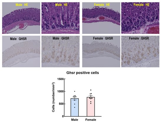 - Matsubara, M.; Sakata, I.; Wada, R.; Yamazaki, M.; Inoue, K.; Sakai, T. Estrogen modulates ghrelin expression in the female rat stomach. Peptides 2004, 25, 289–297. [Google Scholar] [CrossRef]