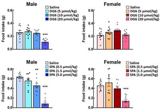 - Gayle, D.A.; Desai, M.; Casillas, E.; Beloosesky, R.; Ross, M.G. Gender-specific orexigenic and anorexigenic mechanisms in rats. Life Sci. 2006, 79, 1531–1536. [Google Scholar] [CrossRef]