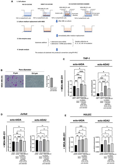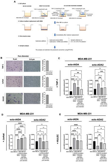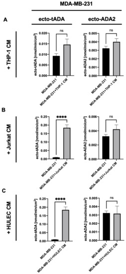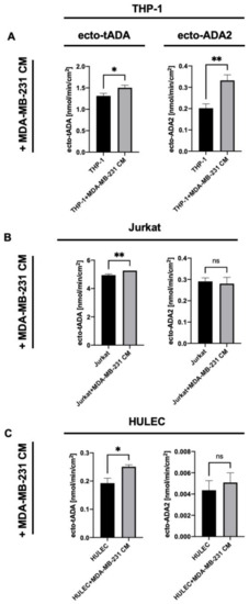 2.1. Immune and Endothelial Cells Modulate ADA1 Activity on the Surface of MDA-MB-231 Triple Negative Breast Cells