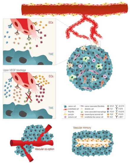 - Chang, Y.S.; di Tomaso, E.; McDonald, D.M.; Jones, R.; Jain, R.K.; Munn, L.L. Mosaic Blood Vessels in Tumors: Frequency of Cancer Cells in Contact with Flowing Blood. Proc. Natl. Acad. Sci. USA 2002, 97, 14608–14613. [Google Scholar] [CrossRef]