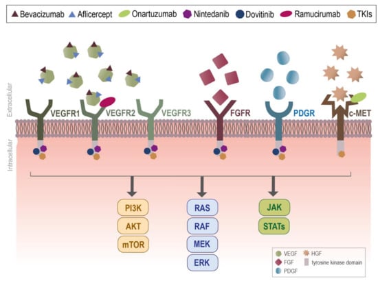 VEGF blockers act on the recognition and neutralization of all bioactive forms of VEGF, preventing VEGFRs activation and consequently inhibiting tumor growth []. However, compensatory mechanisms of other angiogenic mediators may be responsible for patients’ resistance to VEGF signaling pathway blockage (Figure 1). For instance, in metastatic colorectal cancer patients, bevacizumab was associated with increased plasma levels of placental growth factor (PIGF), FGF, and platelet-derived growth factor (PDGF), prior or along disease progression [,]. Other studies have been reporting the tumor vessels normalization in hepatocellular carcinoma models and the improved efficacy of VEGF-targeted therapy in ocular disease as outcomes of PIGF blockage [].