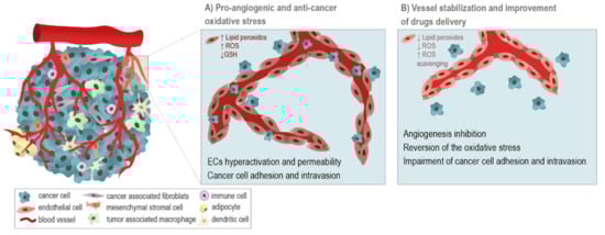 Increased oxidative stress activates endothelial cells (ECs) and kills cancer cells, and antioxidant mechanisms can stabilize vessels and improve anti-cancer chemotherapy. (A) A pro-angiogenic oxidative microenvironment, through the increased generation of ROS, the accumulation of lipid peroxides and glutathione (GSH) depletion is implicated in the promotion of ECs hyperactivation, vessels leakiness, and cancer cells migration and intravasation. (B) ROS scavenging activity is anti-angiogenic, since on one hand, it impairs the ECs activation, and on other hand, it promotes vessels normalization, pivotal to impair metastasis and improve the delivery of chemotherapeutic agents.