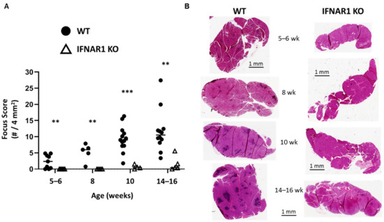 As we have shown previously, IFNAR1-deficient (IFNAR1 KO) NOD mice are protected from developing lacrimal gland inflammation. IFNAR1 is expressed by many immune and non-immune cells, and type I IFN signaling has many downstream effects [5,21]. To characterize the impact of type I IFN signaling on disease over time, lacrimal glands were harvested from wild-type (WT) and IFNAR1 KO male NOD mice at various time points. Our previous work demonstrated that by 14–16 weeks of age, WT male NOD mice develop robust inflammation compared to IFNAR1 KO NOD mice [19]. Here, we found lacrimal gland inflammation in some WT mice as early as five to six weeks of age with all WT mice developing some degree of focal infiltrates at eight weeks and increased inflammation over time (Figure 1). In contrast, no inflammation was detected in lacrimal glands of IFNAR1 KO mice before 10 weeks, and even then the inflammation was minimal (Figure 1). Even at 14–16 weeks, little inflammation was detected in IFNAR1 KO lacrimal glands except for one outlier (Figure 1). This suggests that type I IFN signaling is required for the early signals that disrupt immunological tolerance to promote lymphocytic infiltration of lacrimal glands in NOD mice.