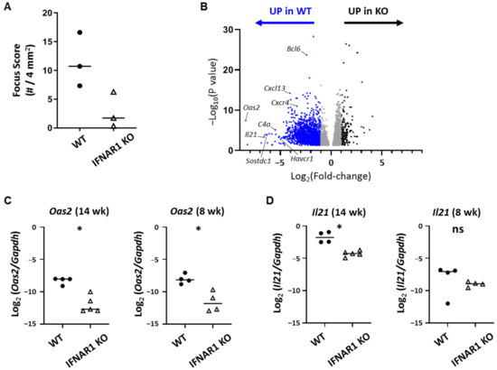 Given the many cell types that express IFNAR1, we performed whole tissue RNA sequencing studies to identify immune genes and pathways upregulated in the context of lacrimal gland autoimmunity in WT NOD mice compared to IFNAR1 KO NOD mice. For these studies, we isolated RNA from 20–21-week-old WT and IFNAR1 KO NOD mice. Samples from the IFNAR1 KO group had lower focus scores than those in the WT group (Figure 2A). Gene expression analyses identified 4371 significantly differentially expressed (DE) genes including 1854 genes with at least two-fold change between WT and IFNAR1 KO. Of these, 1663 were upregulated in WT compared to IFNAR1 KO lacrimal glands and 191 were upregulated in IFNAR1 KO glands (Figure 2B, Table 1, Supplemental Table S1). The top hit for DE genes upregulated in WT compared to IFNAR1 KO lacrimal glands was Oas2, which was expressed >340-fold higher in WT lacrimal glands (Table 1). We validated differential expression of Oas2 with qPCR demonstrating upregulation of Oas2 in WT lacrimal glands of 14-week-old NOD mice (Figure 2C). The upregulation of Oas2 was also evident in WT lacrimal glands in 8-week-old NOD mice (Figure 2C), an age when inflammation was just becoming established (Figure 1), suggesting that downstream effects of type I IFN signaling were already apparent at this early time. Additional members of the OAS family were identified in our RNA sequencing analysis as DE with increased expression in WT lacrimal glands with 11–13-fold upregulation (Oas3, Oasl2), five to seven-fold upregulation (Oas1g, Oas1a), or ~four-fold upregulation (Oas1b, Oasl1, Oas1c) in WT lacrimal glands (Supplemental Table S1). Moreover, among those genes most highly DE in WT lacrimal glands was Il21 (~100-fold) (Table 1), which we validated with qPCR as upregulated in 14-week-old NOD mice (Figure 2D). In contrast to Oas2, Il21 was not uniformly upregulated in all lacrimal glands of younger (eight-week-old) WT NOD mice (Figure 2D). The genes we previously identified by qPCR as upregulated in lacrimal glands of WT compared to 14–16-week-old IFNAR1 KO NOD mice [19] were found to be upregulated in WT glands in these RNA sequencing studies including Ccl19 (14-fold), Cxcl9 (12.6-fold), Ubd (10.9-fold), and Epsti1 (7.5-fold) (Table 1, Supplemental Table S1).